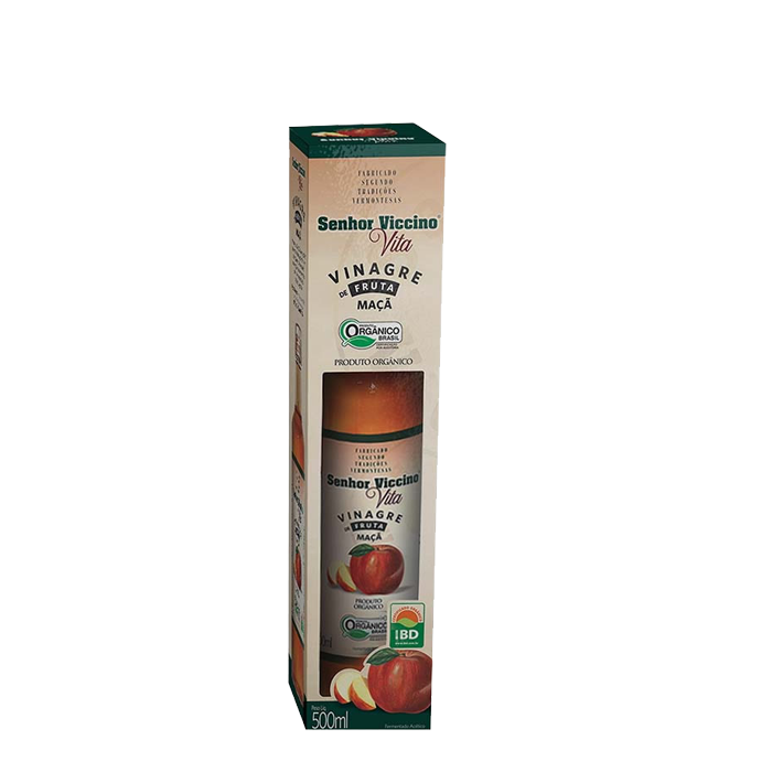O Vinagre de Maçã Senhor Viccino Orgânico, é certificado por certificadora independente Ele não é microfiltrado e nem pasteurizado. Ele é 100% natural, possui embalagem especial e é apresentado em garrafa de vidro de 500 ml, batoque (dosador), tampa de alumínio dourada e lacre de proteção. Possui acidez de 4%.
